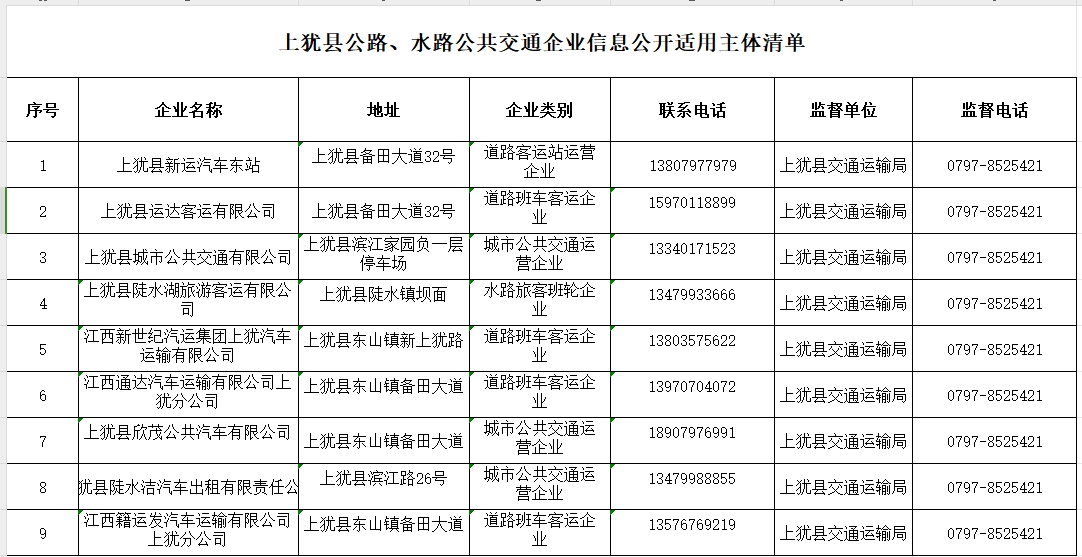 上猶縣公路、水路公共交通企業(yè)信息公開(kāi)適用主體清單