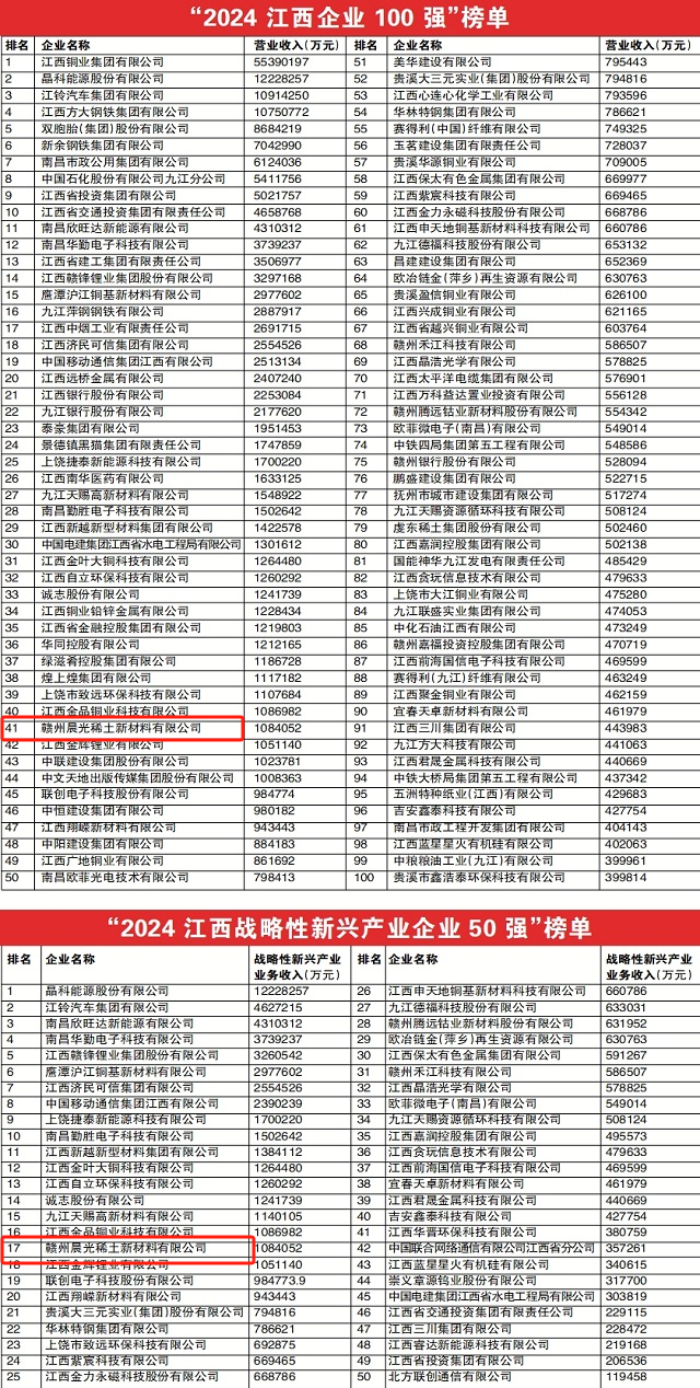 11月20日上午,2024江西企業(yè)100強(qiáng)高峰會(huì)在南昌舉行,會(huì)上發(fā)布了“2024江西企業(yè)100強(qiáng)““2024江西戰(zhàn)略性新興產(chǎn)業(yè)企業(yè)50強(qiáng)“榜單。我縣贛州晨光稀土新材料有限公司營(yíng)業(yè)收入108.4億元,榮登2024江西企業(yè)100強(qiáng)第41位、戰(zhàn)略性新興產(chǎn)業(yè)企業(yè)50強(qiáng)第17位。