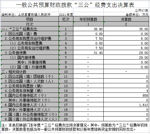 “三公”經(jīng)費支出:指用一般公共預(yù)算財政撥款安排的因公出國(境)費、公務(wù)用車購置及運行維護(hù)費和公務(wù)接待費。其中,因公出國(境)費反映單位公務(wù)出國(境)的國際旅費、國外城市間交通費、住宿費、伙食費、培訓(xùn)費、公雜費等支出;公務(wù)用車購置及運行維護(hù)費反映單位公務(wù)用車車輛購置支出(含車輛購置稅、牌照費),按規(guī)定保留的公務(wù)用車燃料費、維修費、過橋過路費、保險費、安全獎勵費用等支出;公務(wù)接待費反映單位按規(guī)定開支的各類公務(wù)接待(含外賓接待)支出。