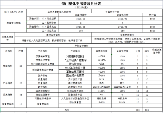 為做好本部門預(yù)算績效管理工作,2021年按時對本部門預(yù)算進(jìn)行了編制以及公開,預(yù)算編報完整、齊全,按時上報年度部門整體支出績效目標(biāo),嚴(yán)格控制“三公經(jīng)費”支出,確保在預(yù)算內(nèi)列支,及時撥付上級財政下?lián)艿馁Y金,確保預(yù)算執(zhí)行率和資金支付率達(dá)標(biāo)。