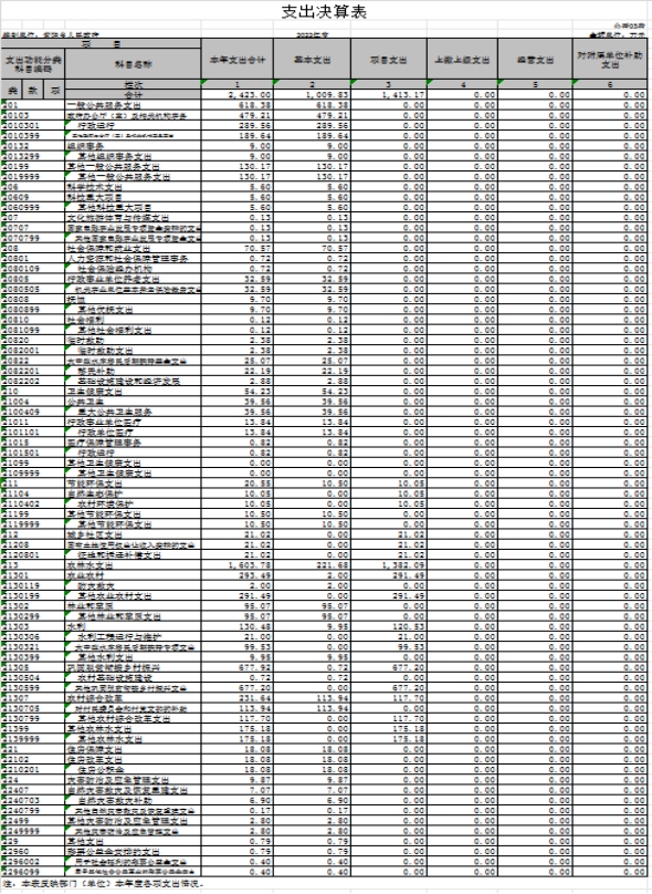 本年支出的具體構(gòu)成為:基本支出1009.83萬(wàn)元,占41.7%;項(xiàng)目支出1413.17萬(wàn)元,占58.3%;經(jīng)營(yíng)支出0萬(wàn)元,占0%;其他支出(對(duì)附屬單位補(bǔ)助支出、上繳上級(jí)支出)0萬(wàn)元,占0%。