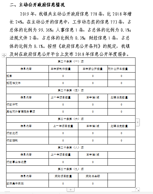 2019年,我鎮(zhèn)共主動公開政府信息778條,比2018年增長24%。在主動公開的信息中,工作動態(tài)類的信息773條,占總體的比例為99.36%;人事信息1條,占總體的比例為0.1%;法規(guī)文件2條,占總體的比例為0.3%;財經(jīng)信息1條,占總體的比例為0.1%。按照《政府信息公開條例》的規(guī)定,我鎮(zhèn)及時在政府信息公開平臺上發(fā)布2018年信息公開年度報告。?