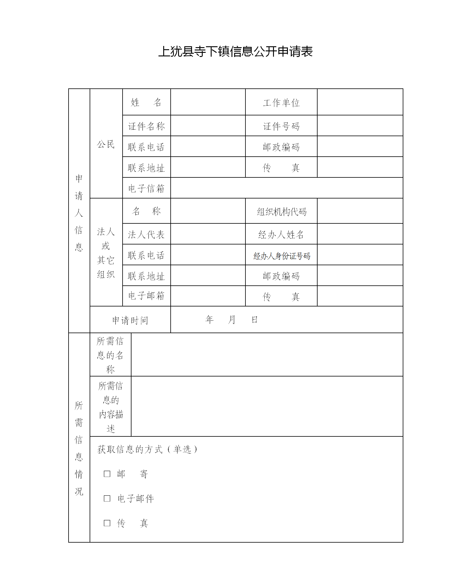公民、法人或者其他組織可以向上猶縣寺下鎮(zhèn)人民政府辦公室提出政府信息公開(kāi)舉報(bào),請(qǐng)通過(guò)郵寄方式寄送舉報(bào)內(nèi)容及相關(guān)證據(jù)材料,并在信封左下角注明“政府信息公開(kāi)”的字樣。上猶縣寺下鎮(zhèn)信息公開(kāi)申請(qǐng)表