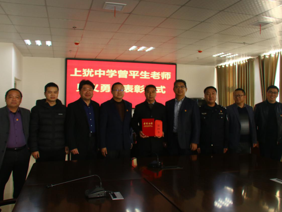 1月27日,縣委政法委組織相關(guān)單位分管領(lǐng)導(dǎo)在上猶中學(xué)為曾平生老師舉行見(jiàn)義勇為表彰儀式。