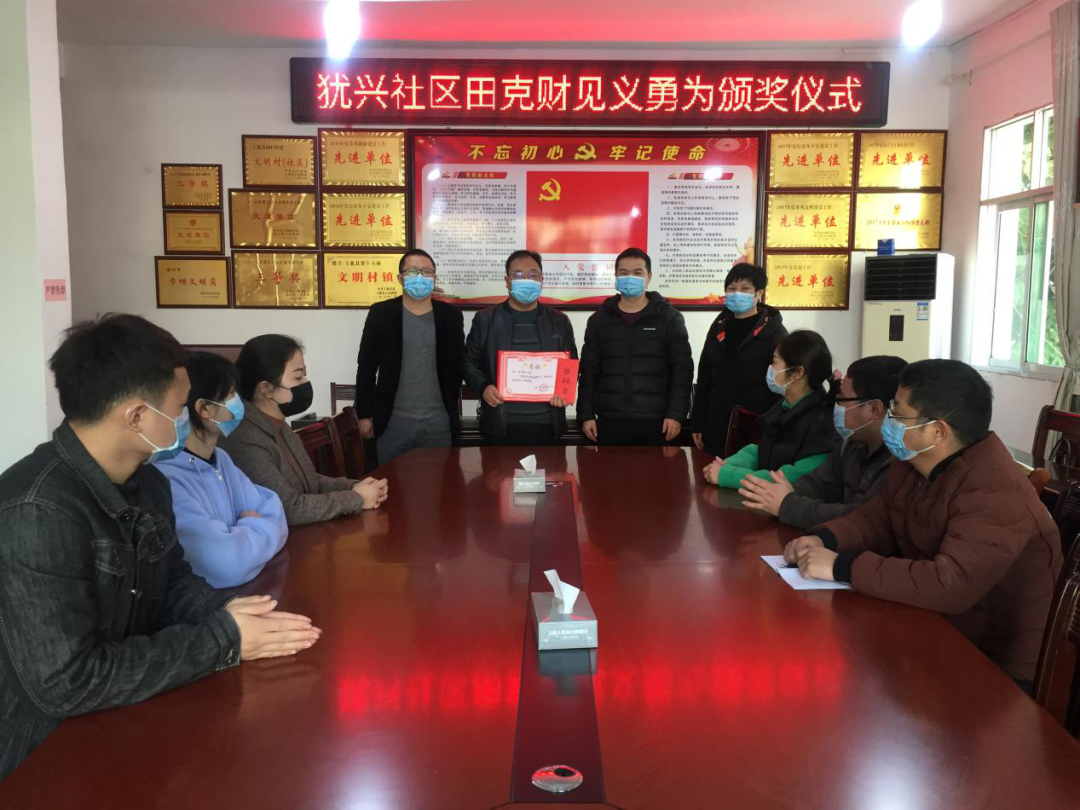 2月3日,縣委政法委組織相關(guān)單位分管領(lǐng)導(dǎo)在猶興社區(qū)為田克財(cái)舉行見(jiàn)義勇為表彰儀式。