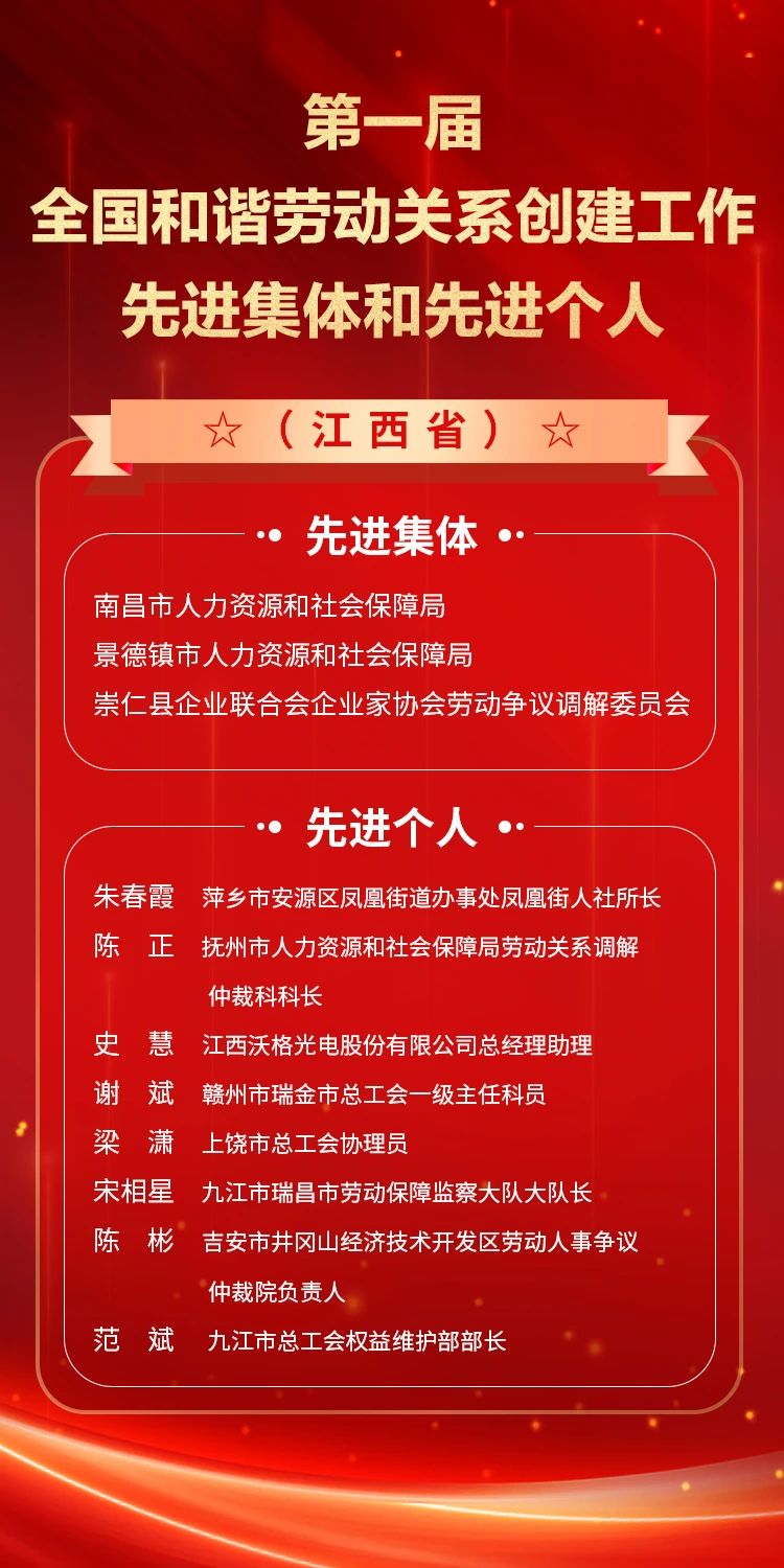 3月19日,國家第一屆全國和諧勞動關系創(chuàng)建工作先進集體和先進個人表彰暨經驗交流會在北京召開。我省南昌市人力資源和社會保障局等3家單位、萍鄉(xiāng)市安源區(qū)鳳凰街道辦事處鳳凰街人社所長朱春霞等8名同志受人力資源和社會保障部、中華全國總工會、中國企業(yè)聯(lián)合會/中國企業(yè)家協(xié)會、中華全國工商業(yè)聯(lián)合會表彰。