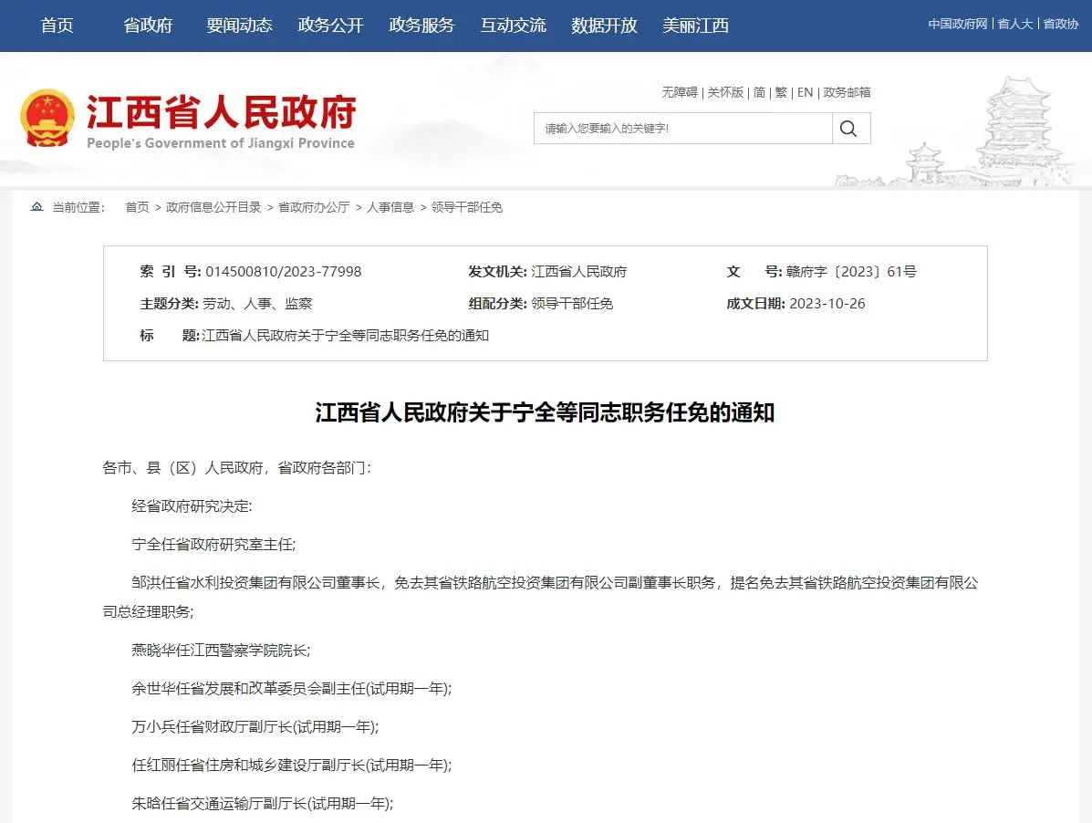 鄒洪任省水利投資集團有限公司董事長,免去其省鐵路航空投資集團有限公司副董事長職務,提名免去其省鐵路航空投資集團有限公司總經(jīng)理職務;