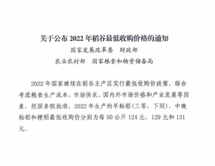關(guān)于公布2022年稻谷最低收購價(jià)格的通知