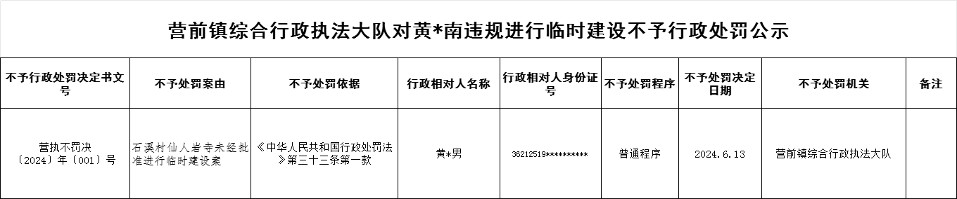 營前鎮(zhèn)綜合行政執(zhí)法大隊對黃*南違規(guī)進行臨時建設(shè)不予行政處罰公示