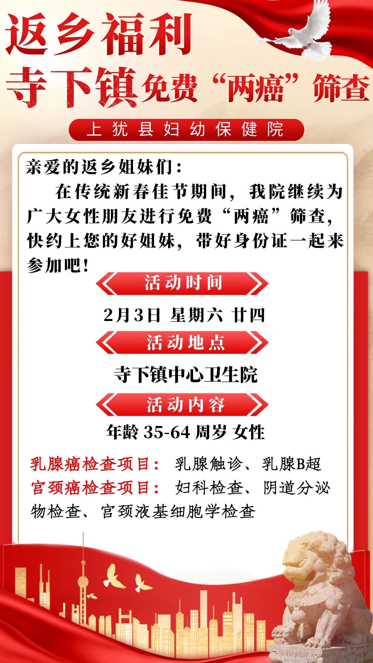 縣婦保院擬定于2月3日針對(duì)返鄉(xiāng)人員在寺下鎮(zhèn)衛(wèi)生院做免費(fèi)"兩癌篩查。