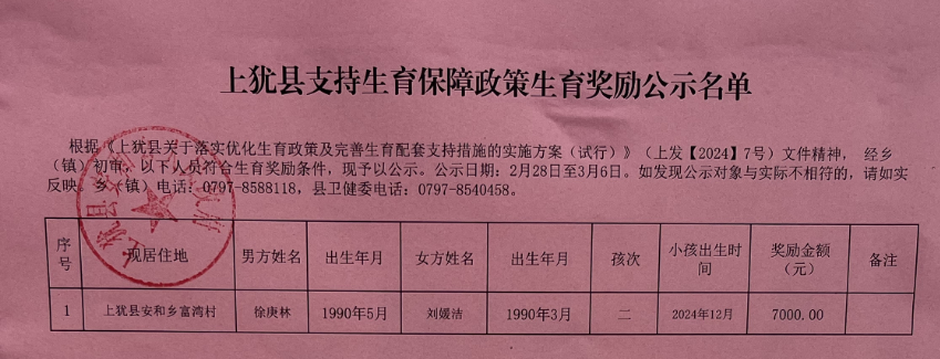 根據(jù)《上猶縣關(guān)于落實優(yōu)化生育政策及完善生育配套支持措施的實施方案(試行)》(上發(fā)【2024】7號)文件精神,經(jīng)安和鄉(xiāng)鄉(xiāng)初審,以下人員符合生育獎勵條件,現(xiàn)予以公示。公示日期:2月28日至3月6日。如發(fā)現(xiàn)公示對象與實際不相符的,請如實反映。安和鄉(xiāng)鄉(xiāng)電話:0797-8588118,縣衛(wèi)健委電話:0797-8540458。