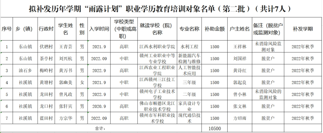 2.擬補(bǔ)發(fā)歷年學(xué)期“雨露計(jì)劃”職業(yè)學(xué)歷教育培訓(xùn)對象名單(第二批)(共計(jì)7人)