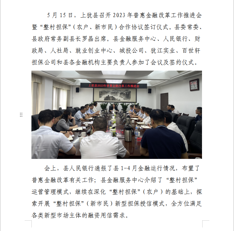 【深化綠色金融改革創(chuàng)新和普惠金融改革試驗(yàn)區(qū)建設(shè)】上猶縣召開(kāi)2023年普惠金融改革工作推進(jìn)會(huì)暨“整村擔(dān)保”合作協(xié)議簽約儀式