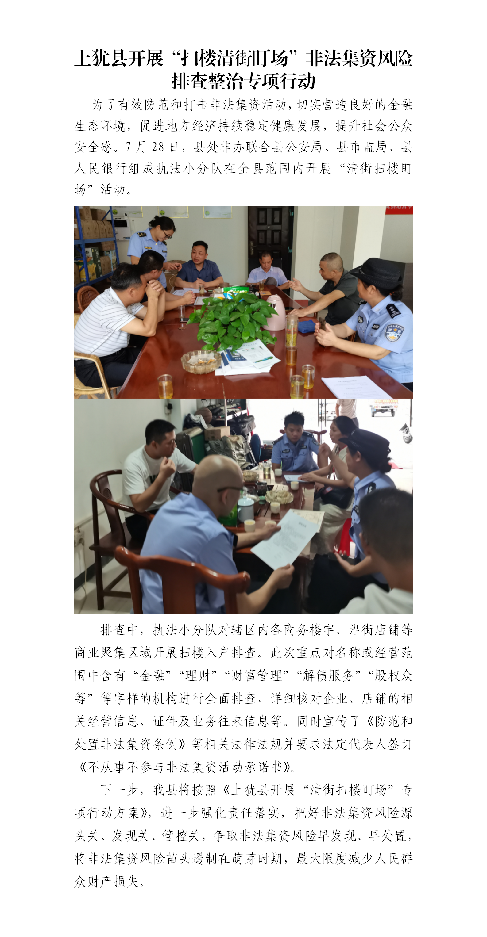 【深化綠色金融改革創(chuàng)新和普惠金融改革試驗(yàn)區(qū)建設(shè)】上猶縣開展“掃樓清街盯場(chǎng)”非法集資風(fēng)險(xiǎn)排查整治專項(xiàng)行動(dòng)情況