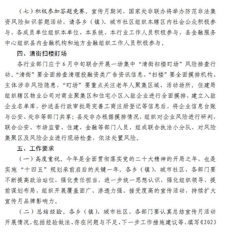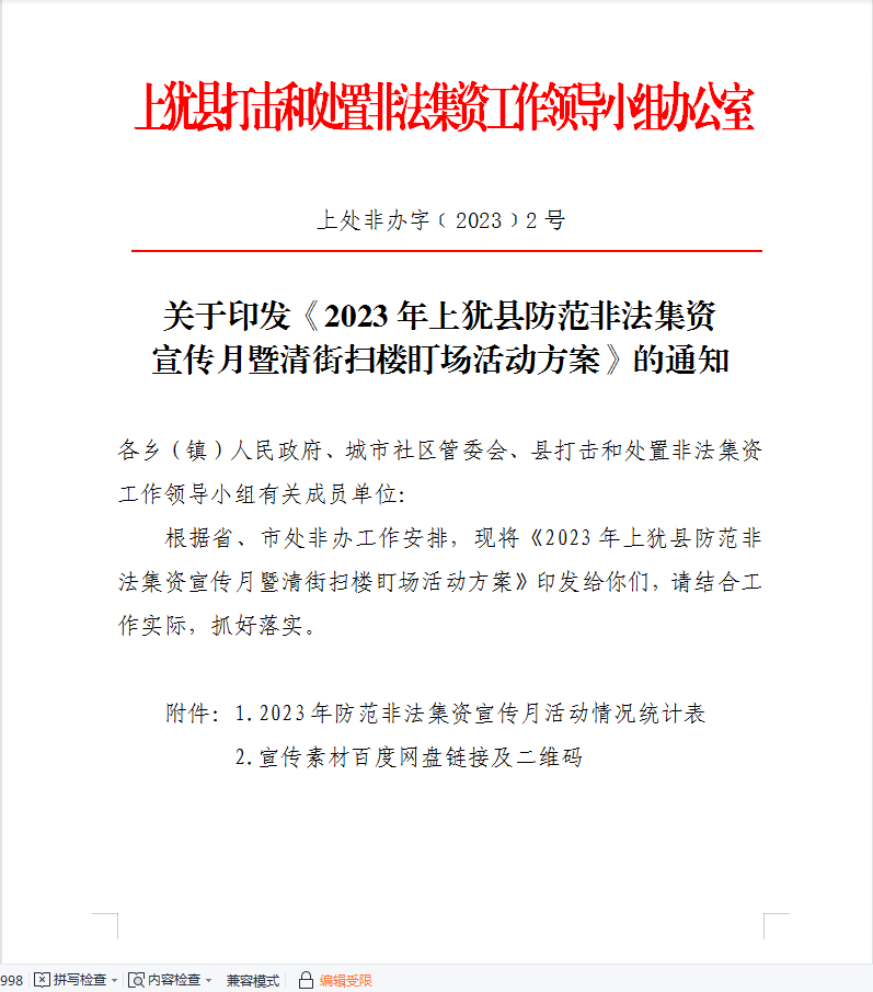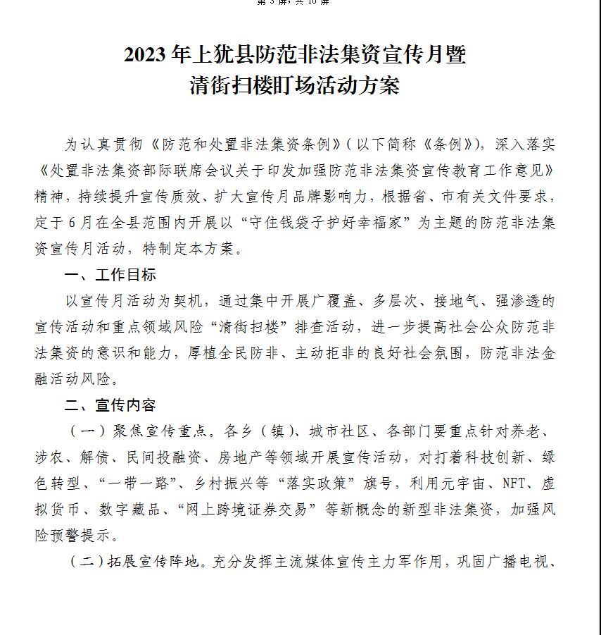 【深化綠色金融改革創(chuàng)新和普惠金融改革試驗區(qū)建設(shè)】關(guān)于印發(fā)《2023年上猶縣防范非法集資宣傳月暨清街掃樓盯現(xiàn)場活動方案》的通知