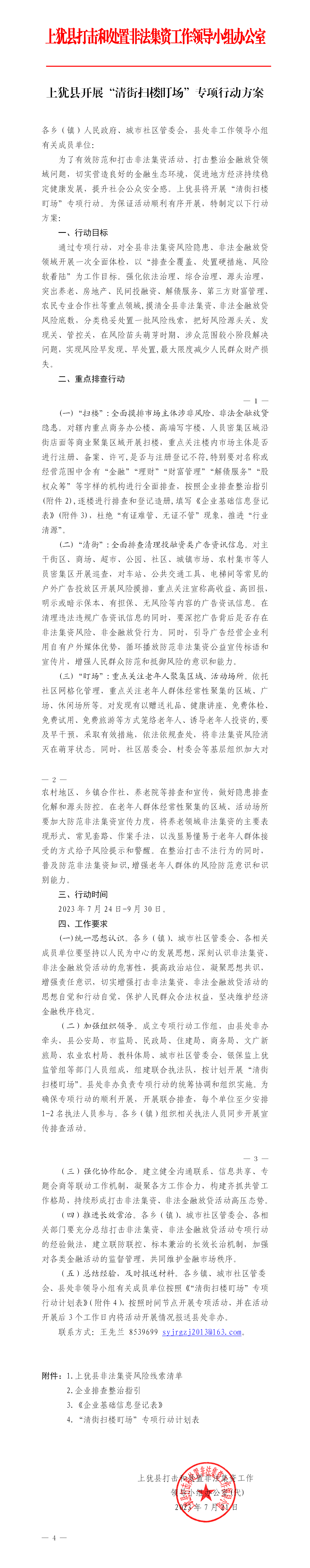 【深化綠色金融改革創(chuàng)新和普惠金融改革試驗(yàn)區(qū)建設(shè)】上猶縣開(kāi)展“清街掃樓盯場(chǎng)”專項(xiàng)行動(dòng)方案