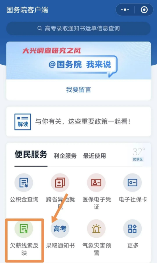 1. 向當(dāng)?shù)氐恼迩忿k(一般設(shè)立在當(dāng)?shù)刈〗ň?,部分地區(qū)設(shè)在人社局)或者上“國務(wù)院客戶端”小程序,按如下流程操作:找到【便民服務(wù)】點(diǎn)開【更多】,在上方菜單欄找到【投訴】,點(diǎn)擊【欠薪線索反映】版塊進(jìn)行線索反映。