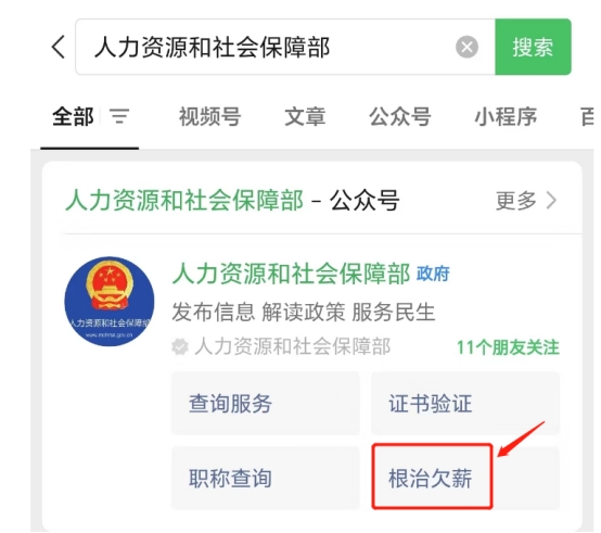 2. 還可以通過登錄【中華人民共和國人力資源和社會保障部】官網(wǎng),點(diǎn)擊下方【根治欠薪】板塊,進(jìn)入后可在上方菜單欄點(diǎn)擊【拖欠農(nóng)民工工資線索反映】進(jìn)入之后根據(jù)指示選擇掃碼進(jìn)入小程序或關(guān)注“人力資源和社會保障部”微信公眾號的方式反映欠薪情況。
