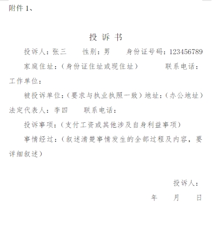 3、投訴書面材料要說明姓名、性別、身份證明、年齡、職業(yè)、工作單位、住所和聯(lián)系方式,用人單位的名稱、住所、法定代表人或者主要負(fù)責(zé)人的姓名、職務(wù);