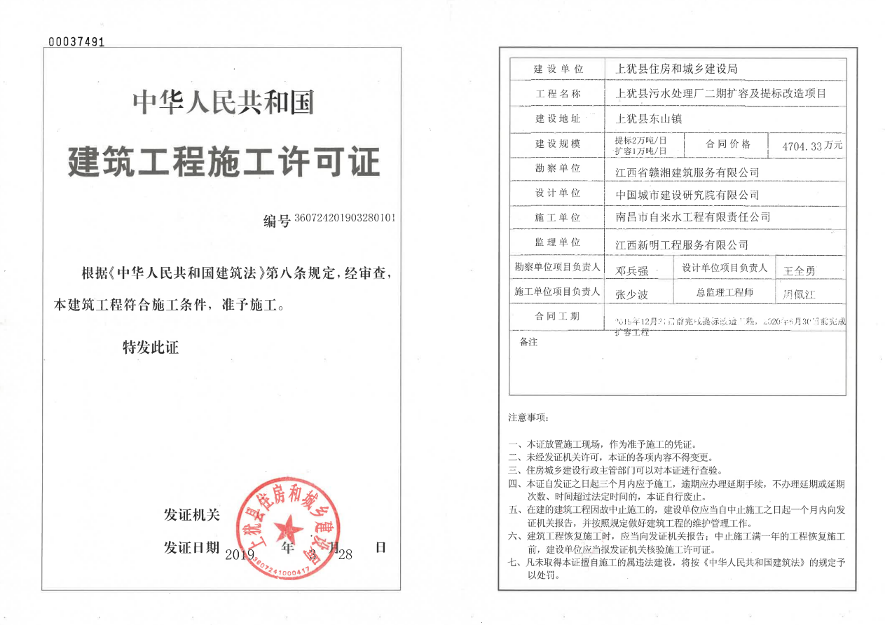 上猶縣污水處理廠二期擴(kuò)容及提標(biāo)改造項(xiàng)目建筑工程施工許可證