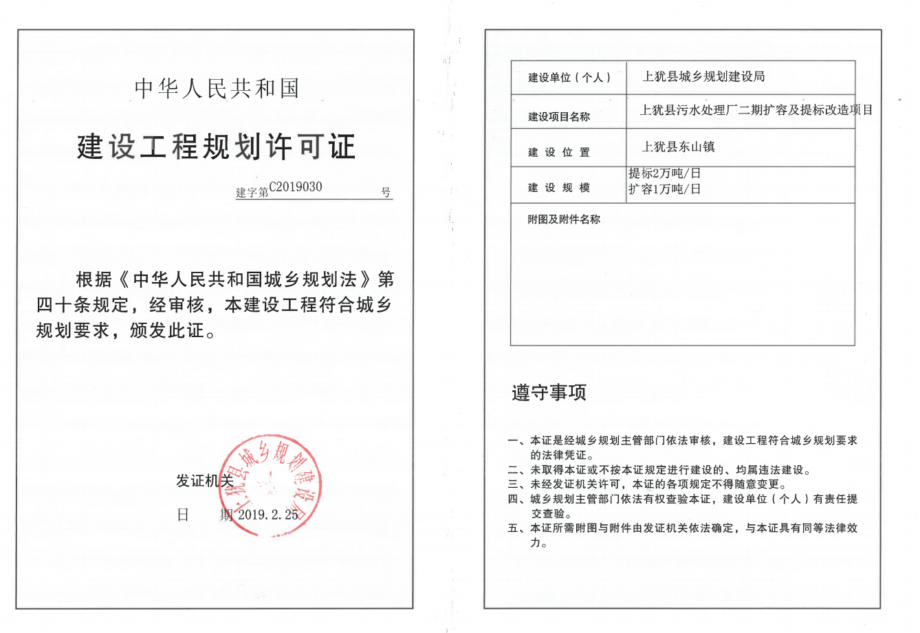 上猶縣污水處理廠二期擴容及提標改造項目建設工程規(guī)劃許可證
