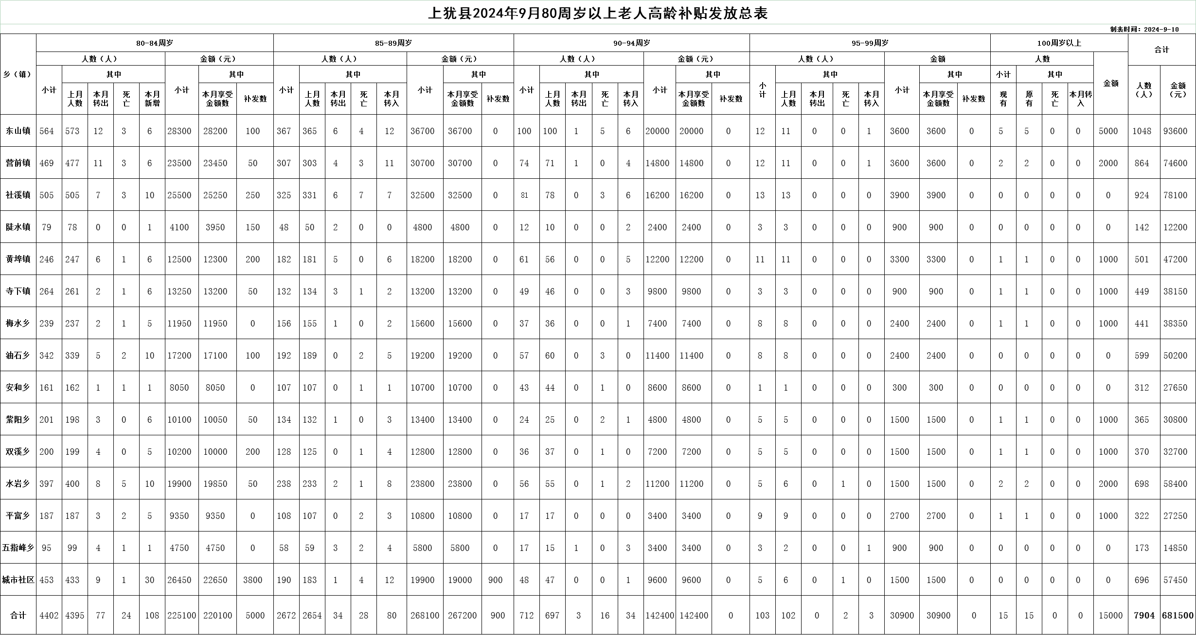 上猶縣2024年9月80周歲以上老人高齡補貼發(fā)放總表