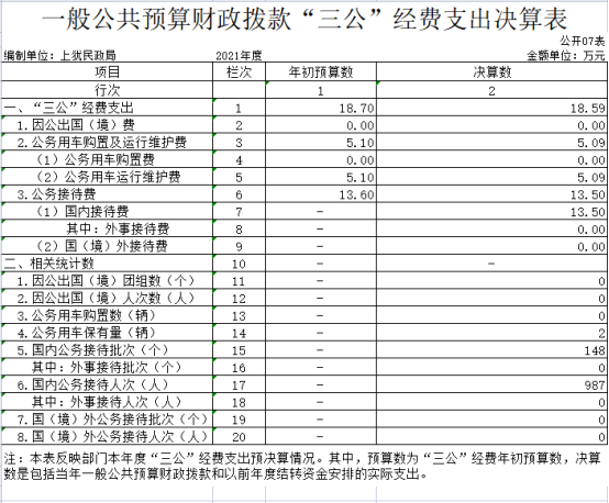 六、“三公”經(jīng)費:指各部門因公出國(境)費、公務(wù)用車購置及運行費和公務(wù)接待費。其中,因公出國(境)費指單位公務(wù)出國(境)的住宿費、旅費、伙食補助費、雜費、培訓(xùn)費等支出;公務(wù)用車購置及運行費指單位公務(wù)用車購置費及租用費、燃料費、維修費、過路過橋費、保險費、安全獎勵費用等支出;公務(wù)接待費指單位按規(guī)定開支的各類公務(wù)接待(含外賓接待)支出。