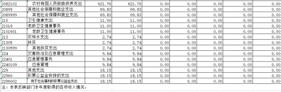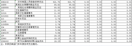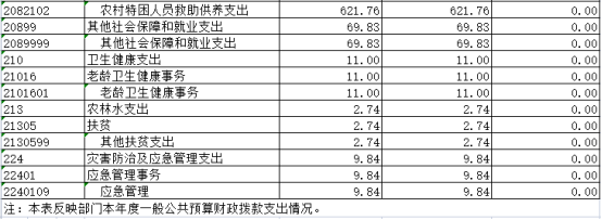(五)災(zāi)害防治及應(yīng)急管理支出年初預(yù)算數(shù)為0萬元,決算數(shù)為 9.84 萬元,完成年初預(yù)算的 100 %,主要原因是:增加養(yǎng)老服務(wù)體系建設(shè)支出。