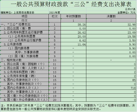 上猶縣司法局本級2021年度一般公共預(yù)算財政撥款“三公”經(jīng)費支出年初預(yù)算數(shù)為38.26萬元,決算數(shù)為32.98萬元,完成預(yù)算的 86.20%,決算數(shù)較2020年增加19.8萬元,增長150.23%,其中: