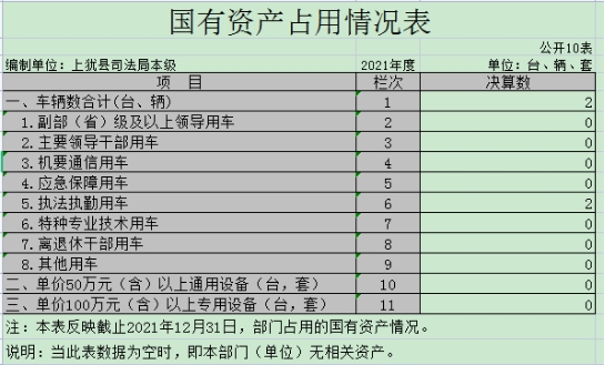 截止2021年12月31日,上猶縣司法局本級(單位)國有資產(chǎn)占用情況見公開10表《國有資產(chǎn)占用情況表》。本部門共有車輛2輛,其中,副部(省)級及以上領(lǐng)導(dǎo)用車0輛、主要領(lǐng)導(dǎo)干部用車0輛、機(jī)要通信用車0輛、應(yīng)急保障用車0輛、執(zhí)法執(zhí)勤用車2輛、特種專業(yè)技術(shù)用車0輛、其他用車0輛;單位價值50萬元以上通用設(shè)備0臺(套);單位價值100萬元以上專用設(shè)備0臺(套)。