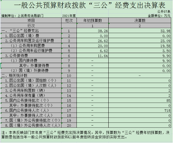 十、“三公”經(jīng)費(fèi):納入同級(jí)財(cái)政預(yù)決算管理“三公”經(jīng)費(fèi),指部門使用財(cái)政撥款安排的因公出國(guó)(境)費(fèi)、公務(wù)用車購(gòu)置及運(yùn)行費(fèi)和公務(wù)接待費(fèi)。其中,因公出國(guó)(境)費(fèi)反映單位公務(wù)出國(guó)(境)的國(guó)際旅費(fèi)、國(guó)外城市間交通費(fèi)、住宿費(fèi)、伙食費(fèi)、培訓(xùn)費(fèi)、公雜費(fèi)等支出;公務(wù)用車購(gòu)置及運(yùn)行費(fèi)反映反映單位公務(wù)用車車輛購(gòu)置支出(含車輛購(gòu)置稅)及租用費(fèi)、燃料費(fèi)、維修費(fèi)、過(guò)路過(guò)橋費(fèi)、保險(xiǎn)費(fèi)、安全獎(jiǎng)勵(lì)費(fèi)用等支出;公務(wù)接待費(fèi)反映單位按規(guī)定開支的各類公務(wù)接待(含外賓接待)支出。