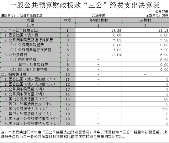 上猶縣司法局本級2020年度一般公共預(yù)算財(cái)政撥款“三公”經(jīng)費(fèi)支出年初預(yù)算數(shù)為19.26萬元,決算數(shù)為13.18萬元,完成預(yù)算的68.43%,決算數(shù)較2019年減少1.47萬元,減少10.03%,其中: