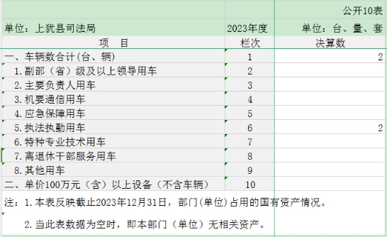 截止2023年12月31日,本部門共有車輛2輛,其中:副部(?。┘?jí)及以上領(lǐng)導(dǎo)用車0輛、主要負(fù)責(zé)人用車0輛、機(jī)要通信用車0輛、應(yīng)急保障用車0輛、執(zhí)法執(zhí)勤用車2輛、特種專業(yè)技術(shù)用車0輛、離退休干部服務(wù)用車0輛、其他用車0輛。本部門單價(jià)100萬元(含)以上設(shè)備(不含車輛)0臺(tái)(套)。
