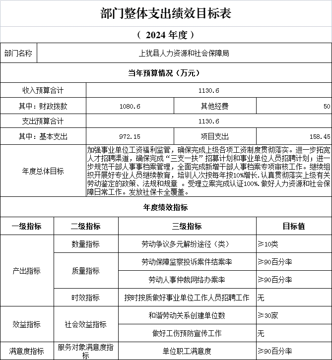 2024年上猶縣人力資源和社會保障局對部門整體支出和項目支出全面實施績效目標管理,2024年部門整體支出預算金額1130.6萬元。根據(jù)以前年度績效評價結(jié)果,優(yōu)化2024年預算安排,并進一步改進管理、完善政策。