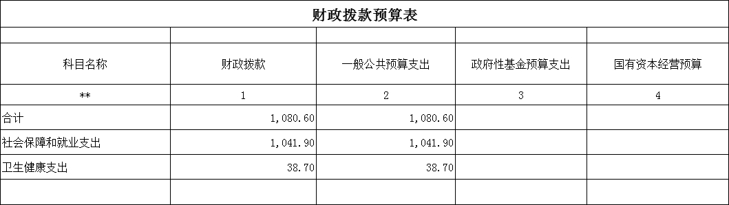 按支出功能科目劃分:社會保障和就業(yè)支出1041.9萬元,較上年預算安排減少57.61萬元;衛(wèi)生健康支出38.7萬元,較上年預算增加38.7萬元。