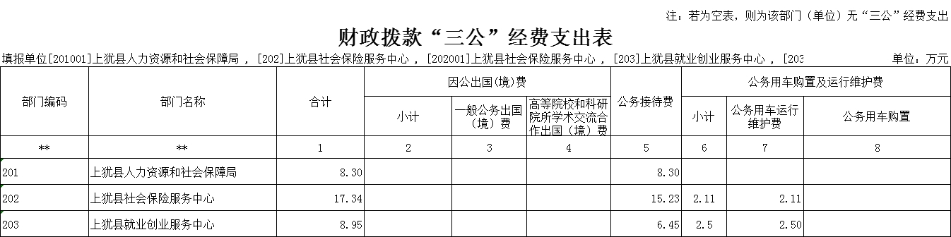 (二)“三公”經(jīng)費:指用財政撥款安排的因公出國(境)費、公務(wù)用車購置及運行維護費和公務(wù)接待費。其中,因公出國(境)費反映單位公務(wù)出國(境)的國際旅費、國外城市間交通費、住宿費、伙食費、培訓費、公雜費等支出;公務(wù)用車購置及運行維護費反映單位公務(wù)用車車輛購置支出(含車輛購置稅、牌照費),按規(guī)定保留的公務(wù)用車燃料費、維修費、過橋過路費、保險費、安全獎勵費用等支出;公務(wù)接待費反映單位按規(guī)定開支的各類公務(wù)接待(含外賓接待)支出。