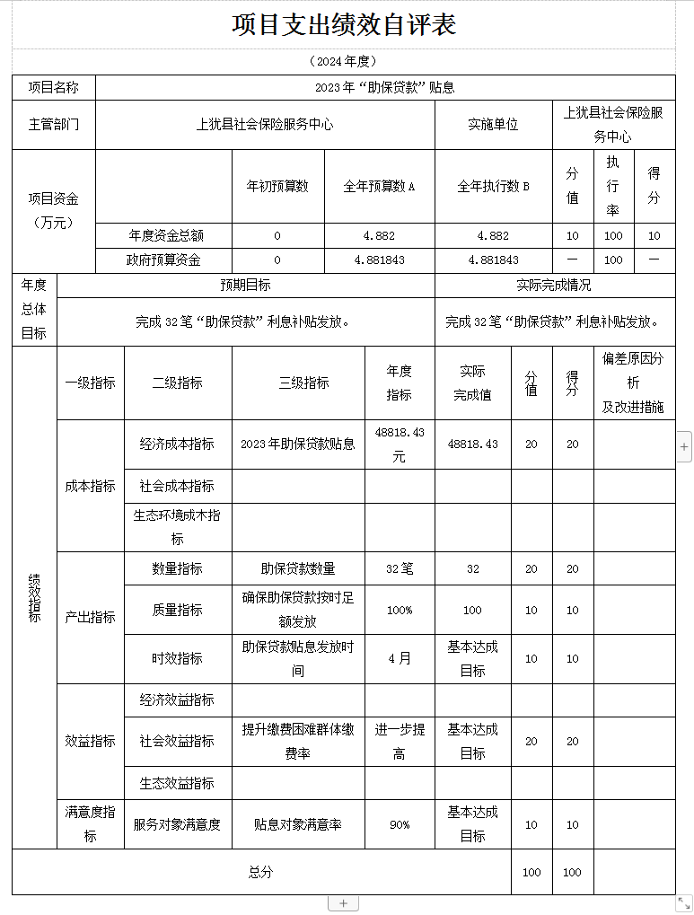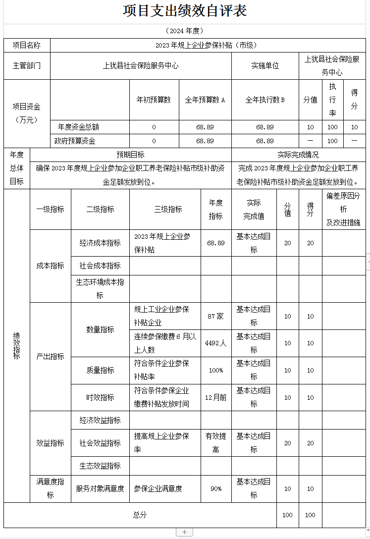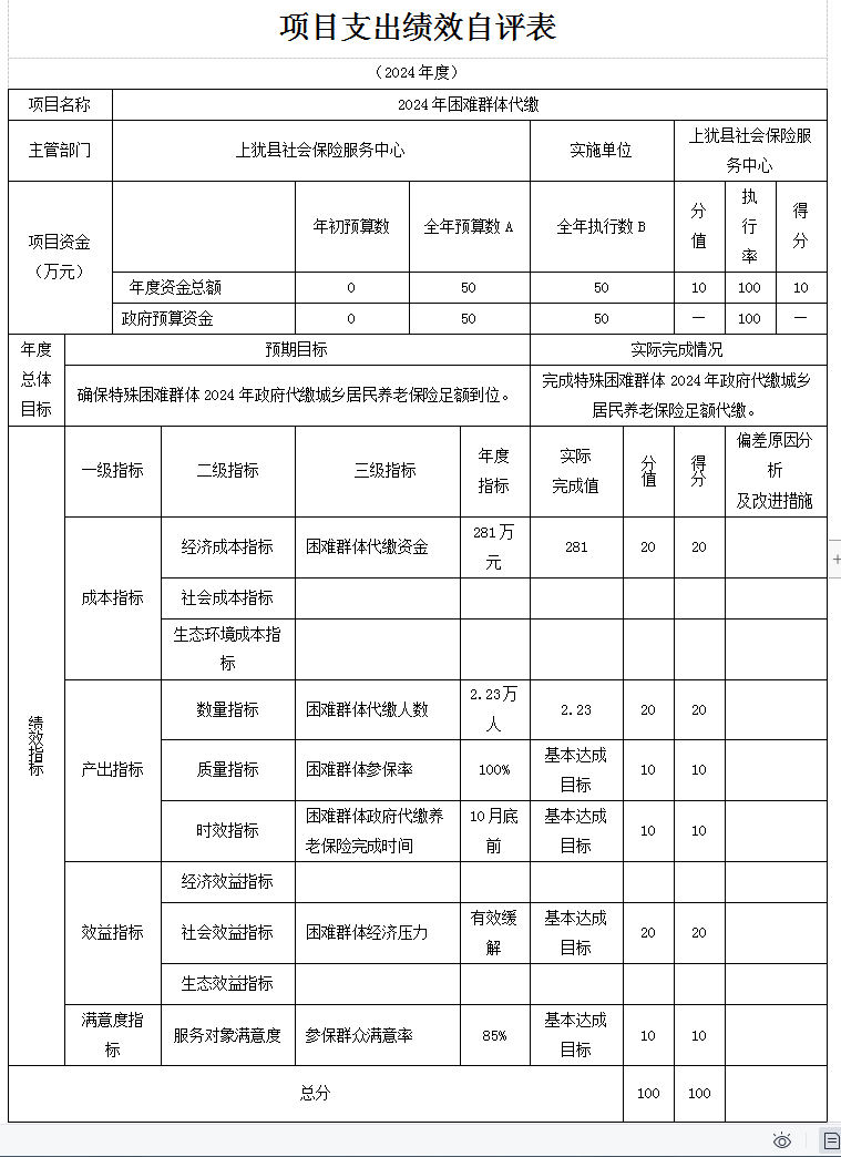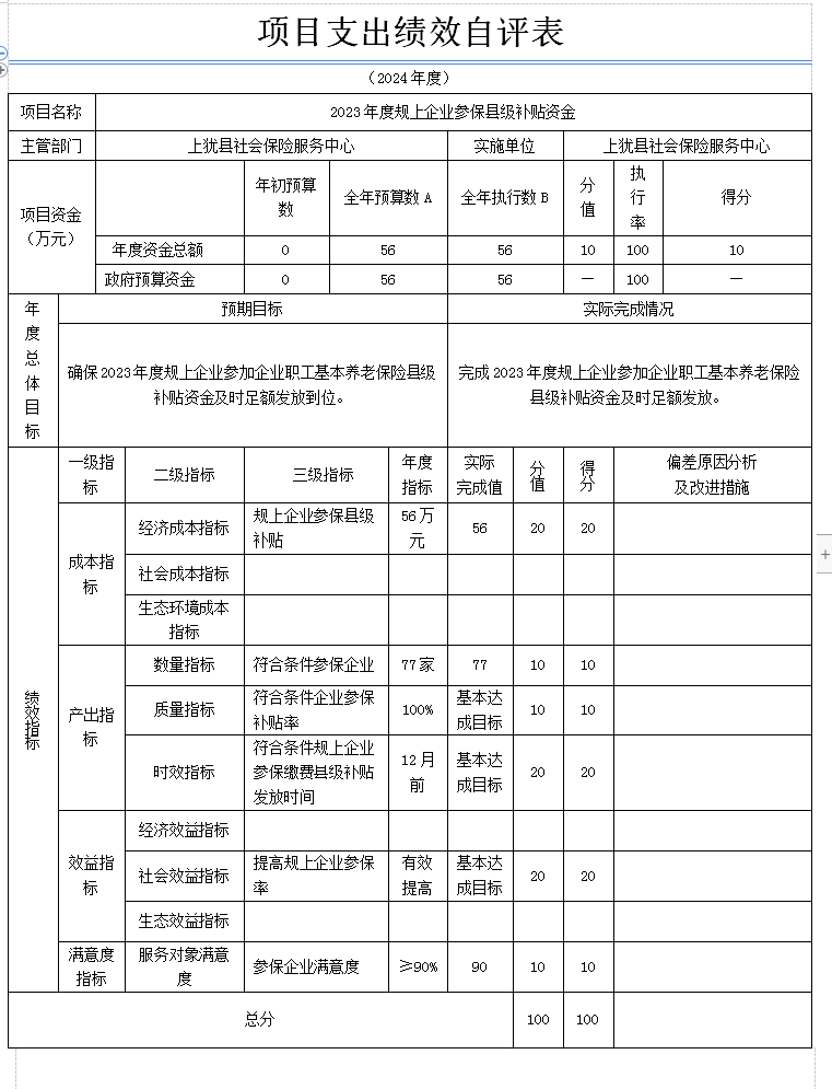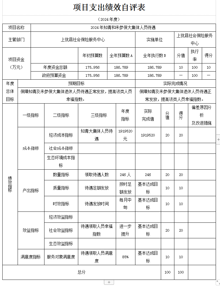 本單位對(duì)城鄉(xiāng)居民基本養(yǎng)老保險(xiǎn)_2024年保障性支出項(xiàng)目、2024年困難群體代繳項(xiàng)目、城鄉(xiāng)居民基本養(yǎng)老保險(xiǎn)_2024年計(jì)生事業(yè)費(fèi)項(xiàng)目、2024年分配上年結(jié)轉(zhuǎn)資金項(xiàng)目、城鄉(xiāng)居民基本養(yǎng)老保險(xiǎn)_省級(jí)城鄉(xiāng)居民養(yǎng)老保險(xiǎn)補(bǔ)助(經(jīng)常性)項(xiàng)目、業(yè)務(wù)事業(yè)費(fèi)項(xiàng)目、2023年度規(guī)上企業(yè)參保縣級(jí)補(bǔ)貼資金項(xiàng)目、2024年副科補(bǔ)貼項(xiàng)目、2024年城居??h級(jí)配套資金項(xiàng)目、2024年保障支出項(xiàng)目、2023年業(yè)務(wù)事業(yè)費(fèi)項(xiàng)目、2024年代繳困難群體養(yǎng)老保險(xiǎn)項(xiàng)目、2024年業(yè)務(wù)事業(yè)費(fèi)項(xiàng)目、城鄉(xiāng)居民基本養(yǎng)老保險(xiǎn)_預(yù)備費(fèi)項(xiàng)目、城鄉(xiāng)居民基本養(yǎng)老保險(xiǎn)_2024年城鄉(xiāng)居民養(yǎng)老保險(xiǎn)縣配套項(xiàng)目、2024年知青和未參保大集體人員待遇項(xiàng)目、2024年被征地農(nóng)民財(cái)政補(bǔ)助項(xiàng)目、2023年“助保貸款”貼息項(xiàng)目、2024城居保省級(jí)補(bǔ)助項(xiàng)目、2023年規(guī)上企業(yè)參保補(bǔ)貼(市級(jí))項(xiàng)目、城鄉(xiāng)居民基本養(yǎng)老保險(xiǎn)_提前下達(dá)2024年省級(jí)城鎮(zhèn)困難群眾脫貧解困項(xiàng)目、代繳2024年新增困難人員城居保項(xiàng)目、2023年規(guī)上企業(yè)參保縣級(jí)補(bǔ)貼資金項(xiàng)目、2024年個(gè)人儲(chǔ)蓄項(xiàng)目、2024年職教幼教師補(bǔ)差項(xiàng)目、國(guó)有企業(yè)職教幼教退休教師待遇補(bǔ)助項(xiàng)目、2024年國(guó)有企業(yè)職教幼教退休教師待遇專項(xiàng)補(bǔ)助項(xiàng)目等項(xiàng)目支出績(jī)效自評(píng)結(jié)果如下: