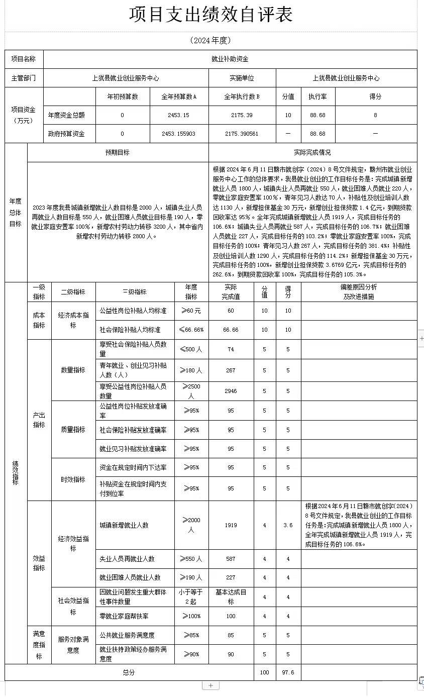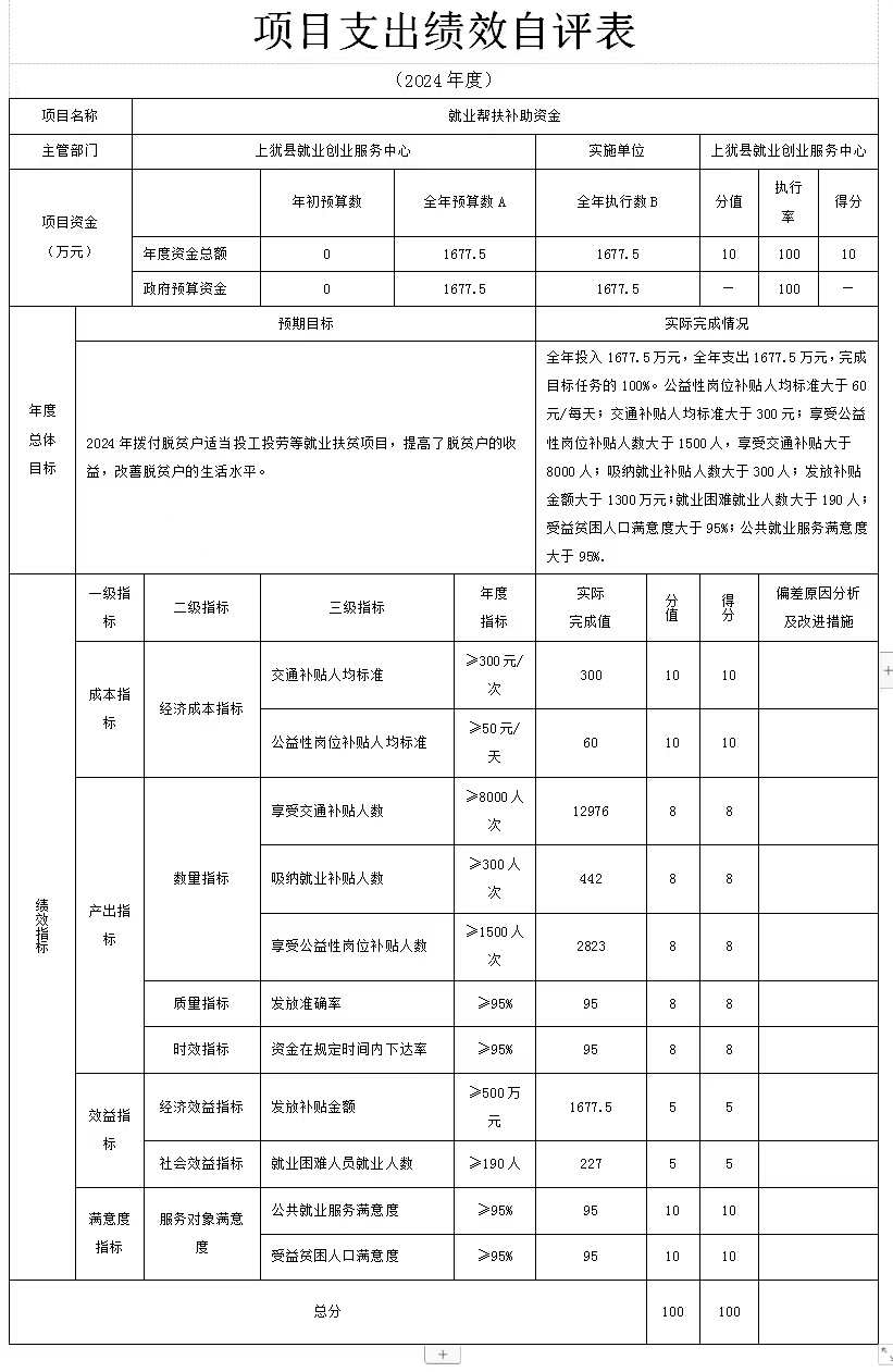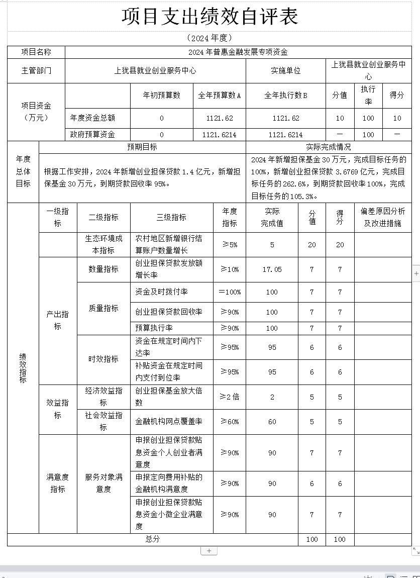 上猶縣就業(yè)創(chuàng)業(yè)服務(wù)中心(本級)“普惠金融發(fā)展專項(xiàng)項(xiàng)目支出績效自評表”“就業(yè)幫扶補(bǔ)助專項(xiàng)項(xiàng)目支出績效自評表”“就業(yè)補(bǔ)助專項(xiàng)項(xiàng)目支出績效自評表”等項(xiàng)目支出績效自評結(jié)果如下: