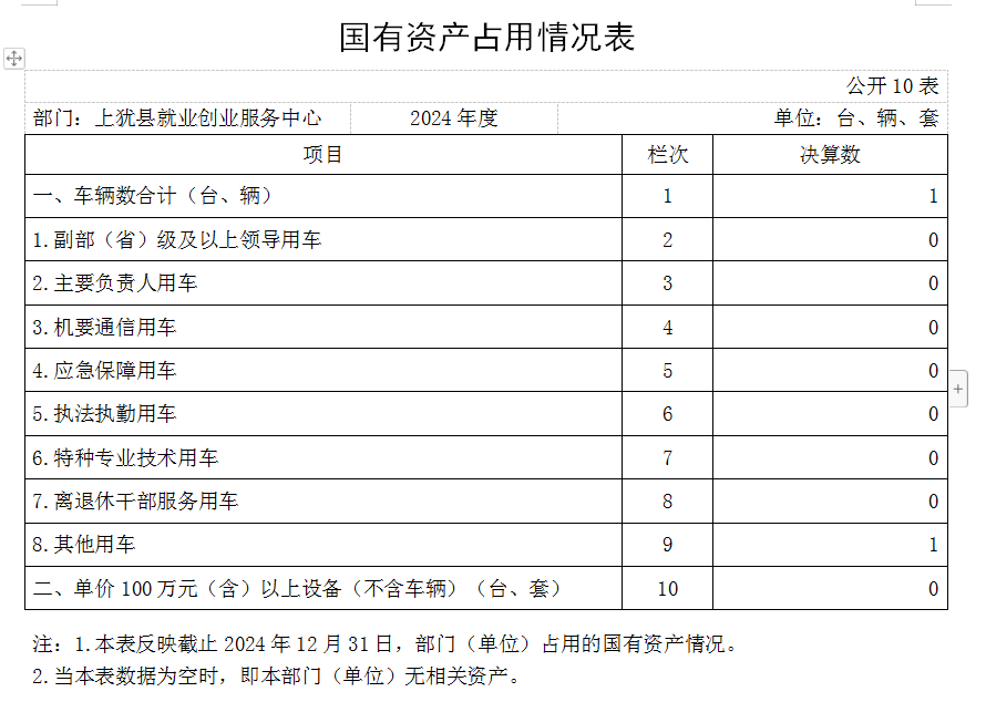 截至2024年12月31日,本部門共有車輛1輛(臺),其中:副部(?。┘壖耙陨项I(lǐng)導(dǎo)用車0輛、主要負(fù)責(zé)人用車0輛、機(jī)要通信用車0輛、應(yīng)急保障用車0輛、執(zhí)法執(zhí)勤用車0輛、特種專業(yè)技術(shù)用車0輛、離退休干部服務(wù)用車0輛、其他用車1輛,其他用車主要是創(chuàng)業(yè)擔(dān)保貸款貸前調(diào)查業(yè)務(wù)用車。本部門單價(jià)100萬元(含)以上設(shè)備(不含車輛)0臺(套)。