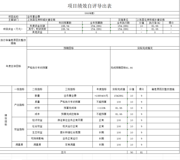 組織對住建局業(yè)務(wù)事業(yè)費(fèi)項(xiàng)目開展了部門評價(jià),涉及一般公共預(yù)算支出188.94萬元,政府性基金預(yù)算支出0萬元,國有資本預(yù)算支出0萬元。從評價(jià)情況來看,項(xiàng)目支出績效管理的重視程度進(jìn)一步提升,執(zhí)行和完成情況較好,資金使用比較規(guī)范。