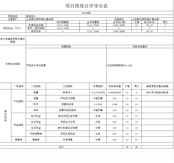 組織對其他收入項(xiàng)目開展了部門評價(jià),涉及城鄉(xiāng)社區(qū)管理事務(wù)預(yù)算支出1110.76萬元,政府性基金預(yù)算支出0萬元,國有資本預(yù)算支出0萬元。從評價(jià)情況來看,本年預(yù)算配置控制較好,預(yù)算管理方面,制度執(zhí)行總體較為有效,但仍需進(jìn)一步強(qiáng)化。