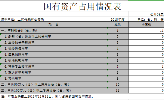 截止2018年12月31日,本部門共有車輛 11 輛,其中,執(zhí)法執(zhí)勤用車4輛、特種專業(yè)技術(shù)用車1輛、其他用車6輛,其他用車主要是公車改革車輛尚未作資產(chǎn)處置。