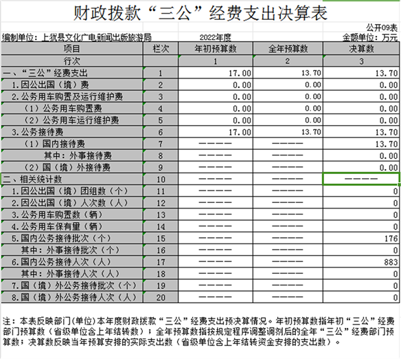 十、“三公”經(jīng)費支出:指用一般公共預算財政撥款安排的因公出國(境)費、公務用車購置及運行維護費和公務接待費。其中,因公出國(境)費反映單位公務出國(境)的國際旅費、國外城市間交通費、住宿費、伙食費、培訓費、公雜費等支出;公務用車購置及運行維護費反映單位公務用車車輛購置支出(含車輛購置稅、牌照費),按規(guī)定保留的公務用車燃料費、維修費、過橋過路費、保險費、安全獎勵費用等支出;公務接待費反映單位按規(guī)定開支的各類公務接待(含外賓接待)支出。