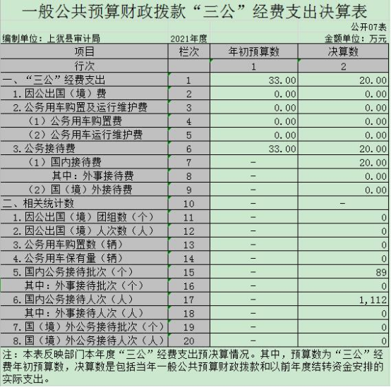 7、“三公”經(jīng)費:指用一般公共預(yù)算財政撥款安排的因公出國(境)費、公務(wù)用車購置及運行維護費和公務(wù)接待費。其中,因公出國(境)費反映單位公務(wù)出國(境)的國際旅費、國外城市間交通費、住宿費、伙食費、培訓(xùn)費、公雜費等支出;公務(wù)用車購置及運行維護費反映單位公務(wù)用車車輛購置支出(含車輛購置稅、牌照費),按規(guī)定保留的公務(wù)用車燃料費、維修費、過橋過路費、保險費、安全獎勵費用等支出;公務(wù)接待費反映單位按規(guī)定開支的各類公務(wù)接待(含外賓接待)支出。