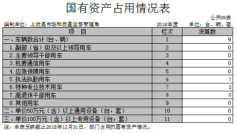 截止2018年12月31日,本部門共有車輛9輛,其中,執(zhí)法執(zhí)勤用車7輛、特種專業(yè)技術(shù)用車2輛;單位價(jià)值50萬(wàn)元以上通用設(shè)備0臺(tái);單位價(jià)值100萬(wàn)元以上專用設(shè)備0臺(tái)。?