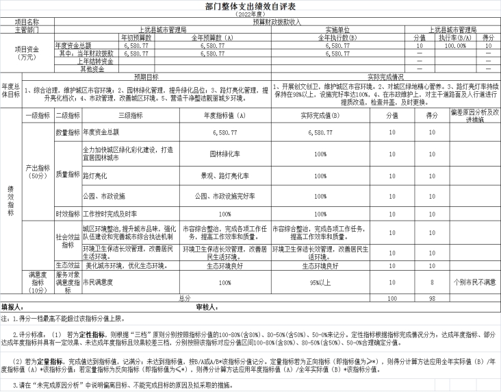 項目績效自評總體綜述:根據(jù)年初設定的績效目標,部門整體支出項目支出項目績效自評得分為98分。項目全年預算數(shù)為6580.77萬元,執(zhí)行數(shù)為6580.77萬元,完成預算的100%。項目績效目標完成情況:一是創(chuàng)建省級“文明城市”工作;二是全力加快城區(qū)綠化彩化建設,打造宜居園林城市;三是提升城市品質(zhì)的市政基礎設施、環(huán)衛(wèi)設施、景觀亮化、綠化提升等工作;四是根據(jù)年初工作規(guī)劃和重點性工作,積極履職,強化管理,較好的完成了年度工作目標;五是通過加強預算收支管理,不斷建立健全內(nèi)部管理制度,梳理內(nèi)部管理流程,部門整體支出管理情況得到提升。發(fā)現(xiàn)的問題及原因:預算編制、會計核算還不夠細致,對于有些能夠細分的工作,未能詳細分類核算,績效評價基礎數(shù)據(jù)不夠精準。下一步改進措施:一是細化預算編制工作,認真做好預算的編制。進一步加強內(nèi)部預算管理意識,嚴格按照預算編制的相關(guān)制度和要求進行預算編制;全面編制預算項目,優(yōu)先保障固定性的、相對剛性的費用支出項目,盡量壓縮變動性的、有控制空間的費用項目,進一步提高預算編制的科學性、嚴謹性和可控性。二是加強財務管理,嚴格財務審核。在費用報賬支付時,按照預算規(guī)定的費用項目和用途進行資金使用審核、列報支付、財務核算,杜絕超支現(xiàn)象的發(fā)生。三是加強學習如何科學合理制定績效目標及考核體系,充分發(fā)揮績效工作效能。四是加強績效評價,確保績效目標的完成。