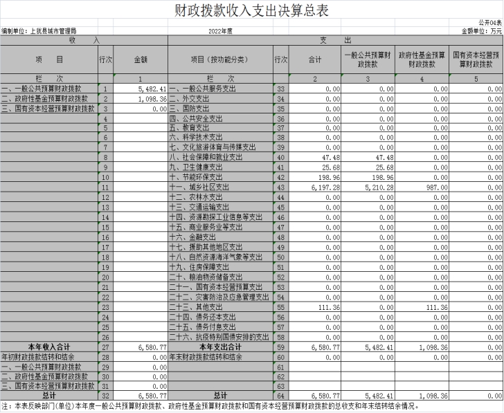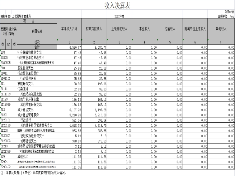 本單位2022年度收入總計6580.77萬元,其中年初結(jié)轉(zhuǎn)和結(jié)余 0萬元,較2021年減少537.71 萬元,下降100 %;本年收入合計6580.77萬元,較2021年減少227.01 萬元,下降3.33 %,主要原因是:城鄉(xiāng)社區(qū)支出收入減少。