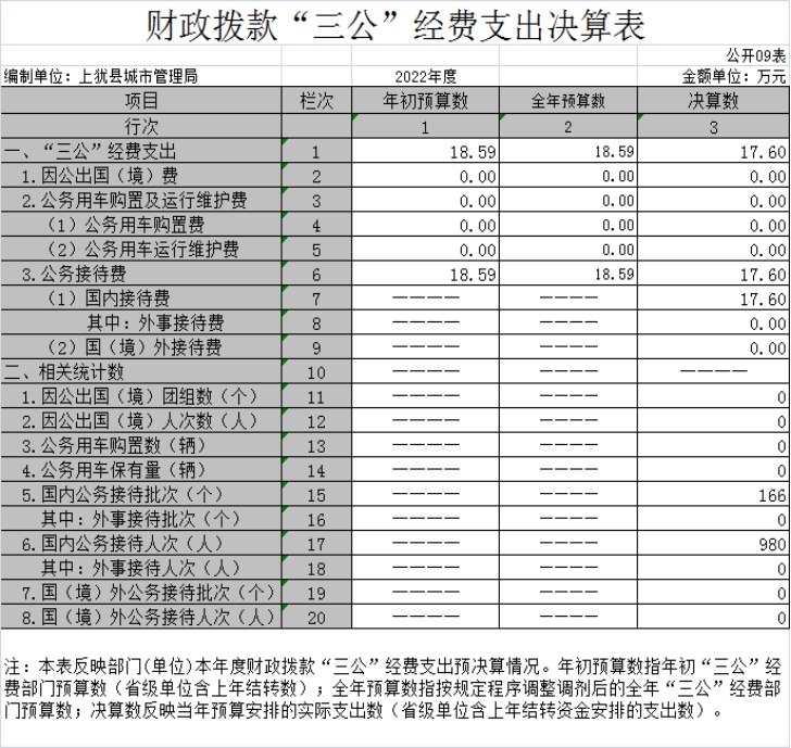 (七)“三公”經(jīng)費支出:指用財政撥款安排的因公出國(境)費、公務用車購置及運行維護費和公務接待費。其中,因公出國(境)費反映單位公務出國(境)的國際旅費、國外城市間交通費、住宿費、伙食費、培訓費、公雜費等支出;公務用車購置及運行維護費反映單位公務用車車輛購置支出(含車輛購置稅、牌照費),按規(guī)定保留的公務用車燃料費、維修費、過橋過路費、保險費、安全獎勵費用等支出;公務接待費反映單位按規(guī)定開支的各類公務接待(含外賓接待)支出。