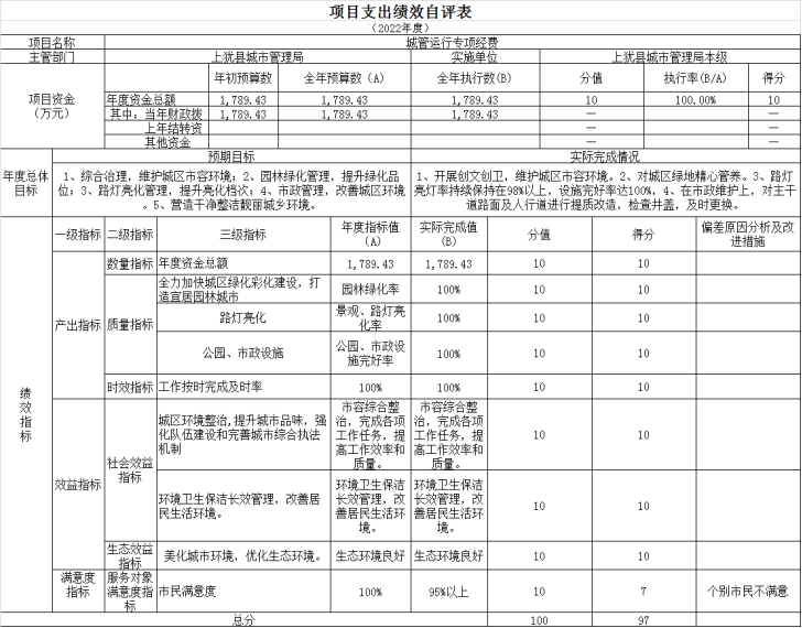 項目績效自評總體綜述:根據(jù)年初設(shè)定的績效目標(biāo),部門整體支出項目支出項目績效自評得分為98分。項目全年預(yù)算數(shù)為7186.04萬元,執(zhí)行數(shù)為7186.04萬元,完成預(yù)算的100%。項目績效目標(biāo)完成情況:一是創(chuàng)建省級“文明城市”工作;二是全力加快城區(qū)綠化彩化建設(shè),打造宜居園林城市;三是提升城市品質(zhì)的市政基礎(chǔ)設(shè)施、環(huán)衛(wèi)設(shè)施、景觀亮化、綠化提升等工作;四是根據(jù)年初工作規(guī)劃和重點(diǎn)性工作,積極履職,強(qiáng)化管理,較好的完成了年度工作目標(biāo);五是通過加強(qiáng)預(yù)算收支管理,不斷建立健全內(nèi)部管理制度,梳理內(nèi)部管理流程,部門整體支出管理情況得到提升。發(fā)現(xiàn)的問題及原因:預(yù)算編制、會計核算還不夠細(xì)致,對于有些能夠細(xì)分的工作,未能詳細(xì)分類核算,績效評價基礎(chǔ)數(shù)據(jù)不夠精準(zhǔn)。下一步改進(jìn)措施:一是細(xì)化預(yù)算編制工作,認(rèn)真做好預(yù)算的編制。進(jìn)一步加強(qiáng)內(nèi)部預(yù)算管理意識,嚴(yán)格按照預(yù)算編制的相關(guān)制度和要求進(jìn)行預(yù)算編制;全面編制預(yù)算項目,優(yōu)先保障固定性的、相對剛性的費(fèi)用支出項目,盡量壓縮變動性的、有控制空間的費(fèi)用項目,進(jìn)一步提高預(yù)算編制的科學(xué)性、嚴(yán)謹(jǐn)性和可控性。二是加強(qiáng)財務(wù)管理,嚴(yán)格財務(wù)審核。在費(fèi)用報賬支付時,按照預(yù)算規(guī)定的費(fèi)用項目和用途進(jìn)行資金使用審核、列報支付、財務(wù)核算,杜絕超支現(xiàn)象的發(fā)生。三是加強(qiáng)學(xué)習(xí)如何科學(xué)合理制定績效目標(biāo)及考核體系,充分發(fā)揮績效工作效能。四是加強(qiáng)績效評價,確保績效目標(biāo)的完成。