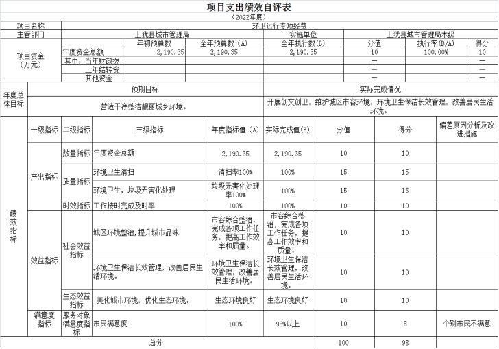 本次績效評價對象為2022年環(huán)衛(wèi)運(yùn)行專項經(jīng)費(fèi)項目,2022年初預(yù)算安排資金2190.35萬元,實(shí)際支出2190.35萬元。